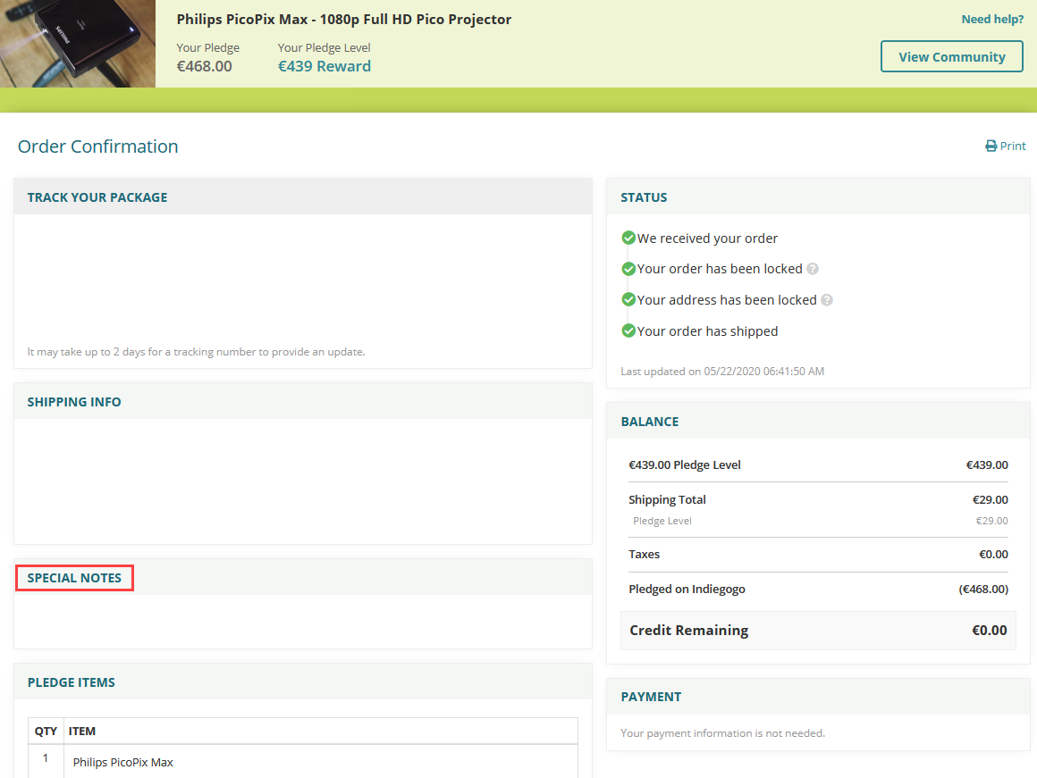 That is probably because you have no special notes associated with your account. Once your data is updated, it will show up on the backerkit page.